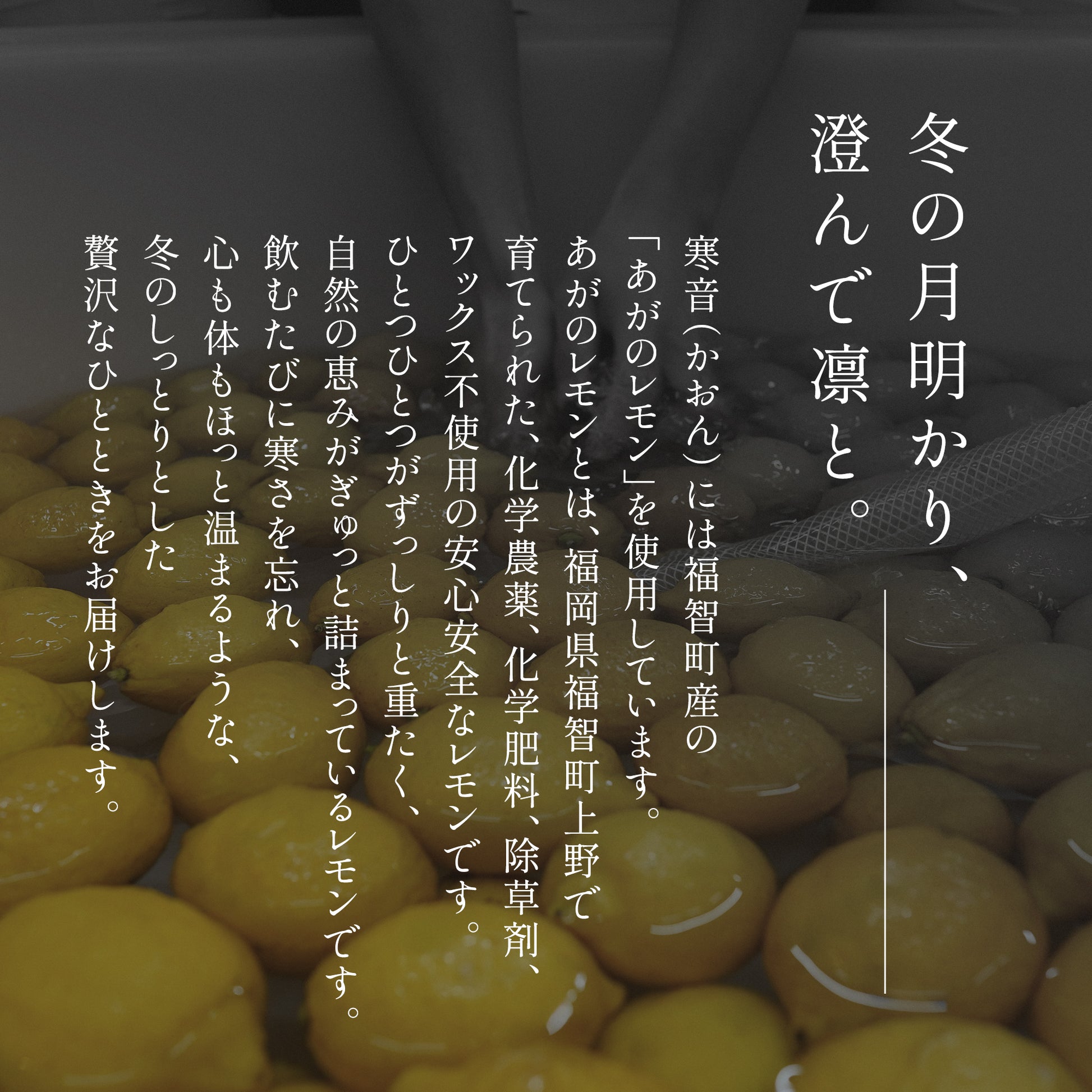 福智町の農薬不使用で育てられたレモンをふんだんに使用し、自然の恵みを最大限に活かした特別なフルーツ酒。果実本来の風味を引き出しながらも、清らかな酒の味わいを調和させ、四季折々の魅力を感じられる一杯に仕上げました。